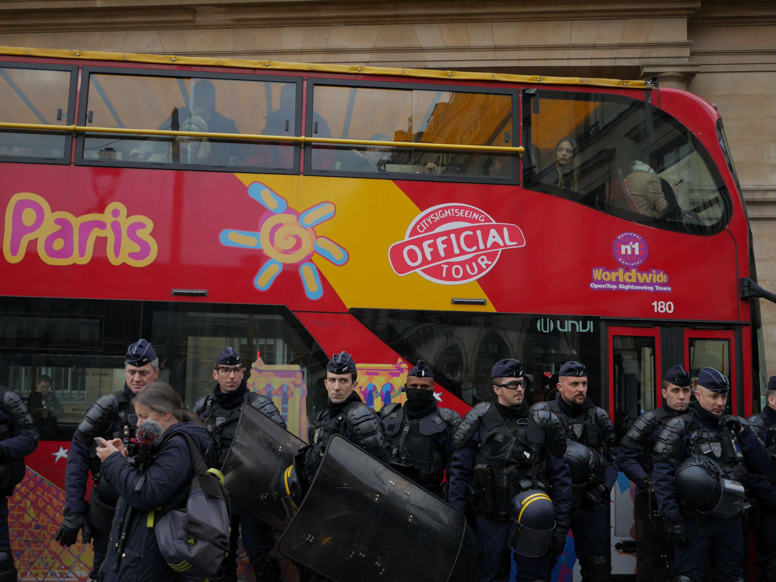 Des FDO alignés devant un bus de tourisme